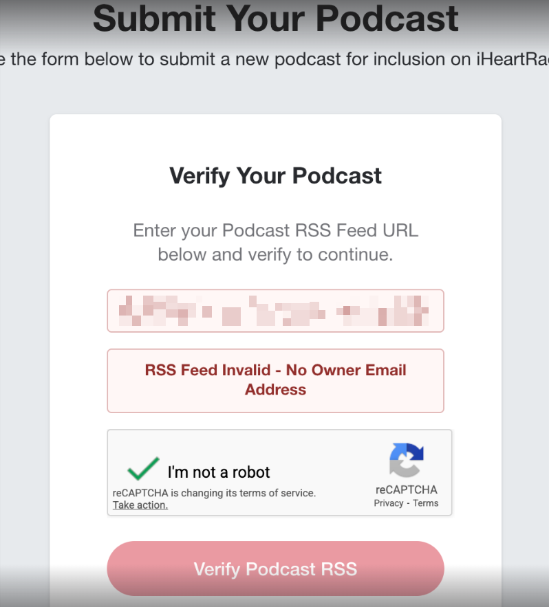 Some services, like iHeart, require an email visible in the feed to validate your show. However, to preserve your privacy, feeds from RSS.com, by default, do not show email addresses.