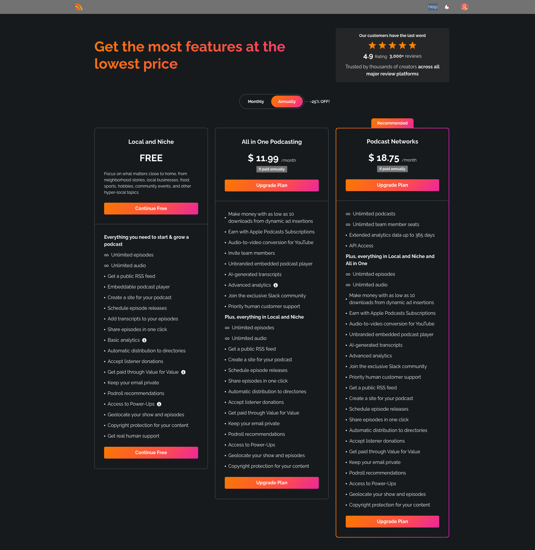 Podcast Networks (Monthly & Annual plans available): Best for larger organizations, podcast networks, or creators with multiple shows. Hosting for unlimited podcasts with unlimited episodes and audio.