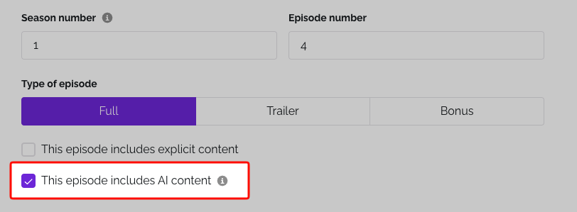 You can mark an episode with the AI tag using the setting next to the Explicit tag: