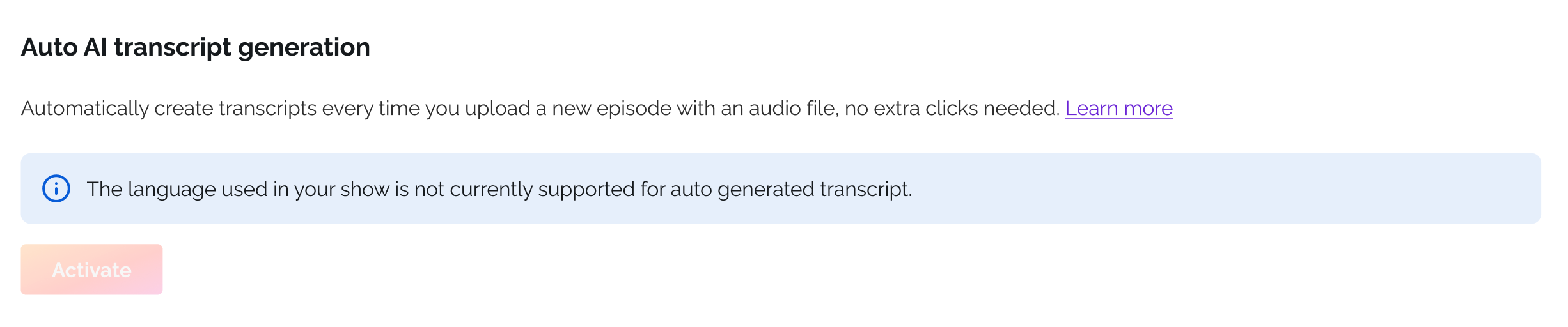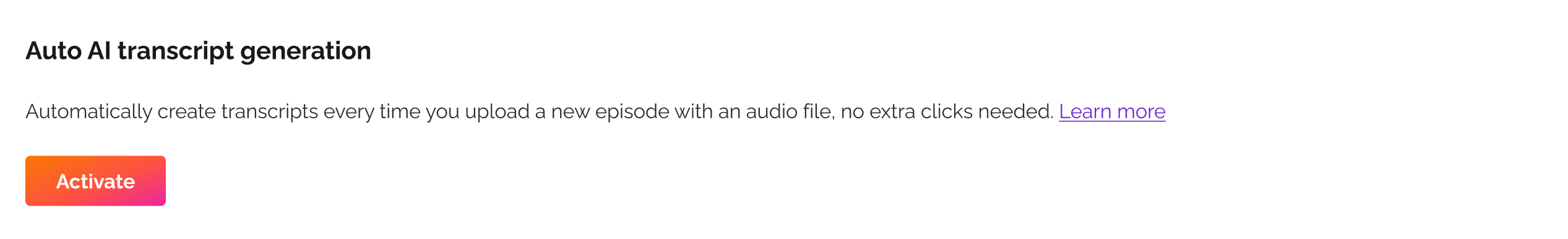 Once active, any new episode you publish will automatically generate a transcript.