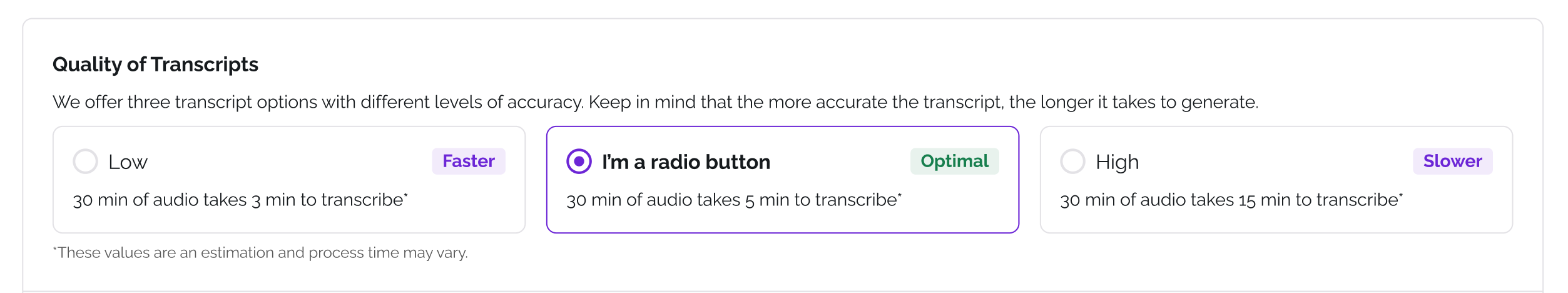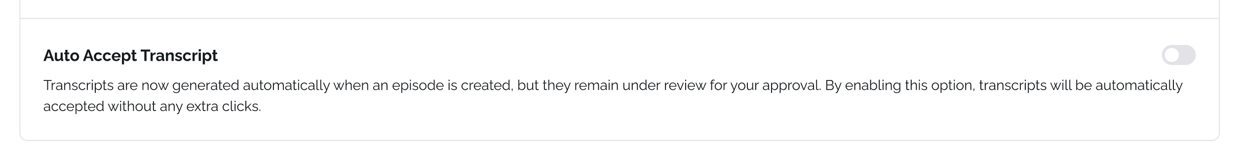 Tip: We recommend leaving Auto-Accept off until you're confident in the quality level you've selected. Once a transcript is published, listeners and platforms can see it immediately.