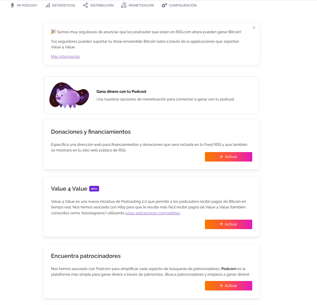 ¡También nos complace anunciar que los podcasters en RSS.com ahora pueden ganar Bitcoin con sus podcasts! Tus oyentes y seguidores pueden apoyar tu show enviando Bitcoin (sats) a través de las aplicaciones Value 4 Value compatibles. Puedes aprender más acerca de esto aquí.