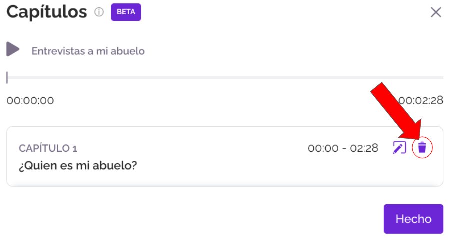 3. Haz clic en el icono de bote de basura para eliminar el capítulo