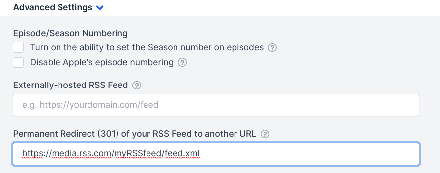 En la sección “Redirección Permanente (301) de tu feed RSS a otro URL” (Permanent Redirect (301) of your RSS Feed to another URL)y pega tu nuevo feed de RSS.com.