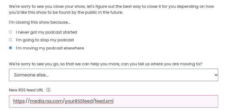 6. Elije la opción "I’m moving my podcast elsewhere" y pega tu feed de RSS.com en la sección “New RSS feed URL”