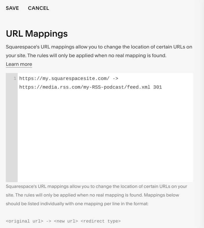 5. En el cuadro de texto, escribe primero tu feed de Squarespace, deja un espacio en blanco, escribe el símbolo ->, deja otro espacio en blanco y luego pega tu feed RSS.com. Al final, escribe el código 302 como se ve en el ejemplo: