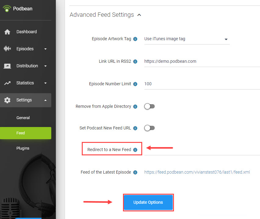 Clicca sulle voci “Settings” > ”Feed” > ”Advanced Feed Settings” per aggiungere l'URL del tuo nuovo feed all'interno del campo "Redirect to a New Feed"